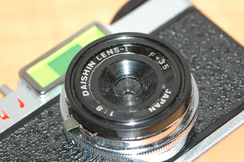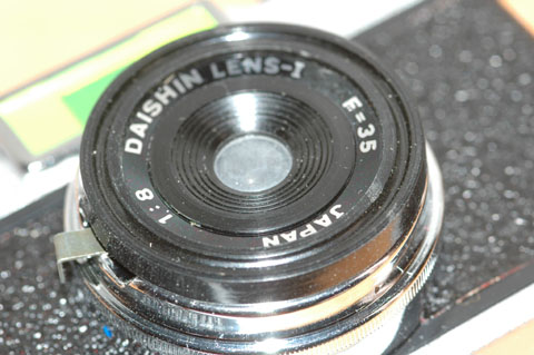 カメラの内側から見れば,レンズ部を止めていると思われる2本のネジが見える。これを緩めても,シャッターユニットごと鏡胴部がはずれるだけで,レンズの裏側には手が届かない。表側にはネジが見えず,接着剤で組み立てられたのであれば,分解は容易ではない。これが「おもちゃ」であることを考えれば,接着剤で組み立てられている可能性も否定できない。