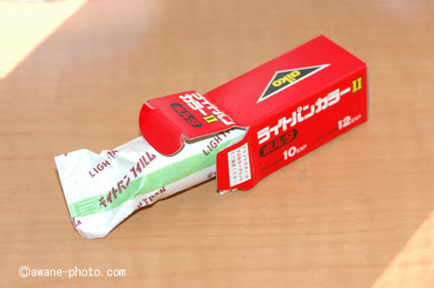 ライトパンの箱には,2枚の説明書がはいっていた。露出表が記されているのかと思えば,さにあらず。1枚にはフィルム装填の注意事項が,もう1枚にはフィルムの入手についてのことが記載されていた。ボルタフィルムを使うカメラは,シャッター速度や絞りの調整がほとんどできないに等しいような「おもちゃカメラ」が多いので,露出表など必要ないだろう。カメラのほうで「天気のよい日に外で写してください」などと説明をしておけば十分だ。