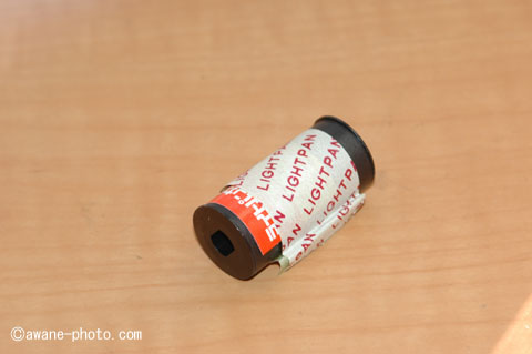 ボルタフィルムの幅は,一般的なパトローネ入り35mmフィルム(135フィルム)と同じく,35mmである。そして,このフィルムを裏紙とともにスプールに巻いたものである。つまり,裏紙とスプールさえあれば,135フィルムのなかみが流用できる。スプールは,入手したカメラのなかに1本はいっている。必要なものは,裏紙ともう1本のスプールだ。どうやって入手すればよいか。