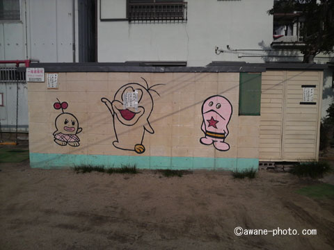 私の記憶のなかでは,この絵はずっと存在している。つまり,この絵が描かたのは,5年前や10年前というレベルではなく,40年くらい前のことかもしれない。そもそも「オバケのQ太郎」が登場したのは,1960年代半ばのこと。当時,もっとも新しい,そしてもっとも人気のあったキャラクタが,この壁に描かれたということなのだろう。それにしても,まったく色あせたようすがないということは,そのあとも定期的に描きかえられていることに相違ない。