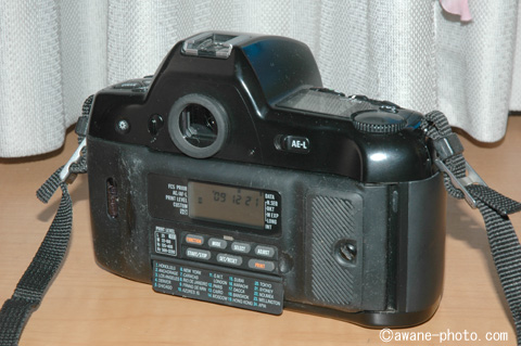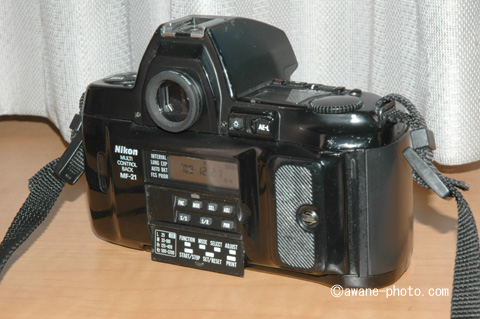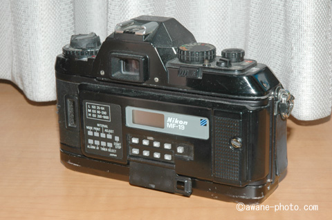 2009年11月30日(月) 天気:晴れ年月日 日時分 時分秒ニコンのAF一眼レフカメラには,裏蓋を交換することで,機能を強化できるようになっているものがあった。そのような裏蓋を使うことで強化される機能としては,オートブラケティング機能やフラッシュ光量の調整など,後の機種によっては標準的に用意されるようなもののほか,インターバルタイマー撮影(一定時間間隔で自動的にレリーズをおこなう)のような特殊な機能も含まれる。もちろん,日付の写しこみも可能である。最初に用意されたのは,F3AFを除いた最初のAF一眼レフカメラ,ニコンF-501用の「マルチデータバックMF-19」というものだ。付加される機能は,各種データの写しこみに加えて,AFトリガー機能(ピントがあうとデータバックからシャッターがレリーズされる),インターバルタイマー機能(一定時間間隔で自動的にレリーズをおこなう)などとなっている(「カメラ総合カタログ vol.85」,1986年)。MF-19はF-301でも使用可能だが,F-301にはAF機能がないため,MF-19の機能のうちAFトリガー機能は利用できない。