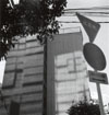 ガラスはその光を反射し,向かいのビルに影を写す。