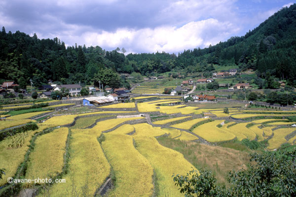 高いところから,棚田をみおろす。この画像ではわかりにくいが,画面中央付近を2人の人が歩いている。そしてそのすぐ右にある黒い点は,電線にとまったカラスである。じつはこの写真中央付近を左右に電線が横切っている。