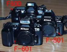 ここに並べたカメラは,ニコンの35mmAF一眼レフである。F-801は高級機,F-601は中級機,F60Dは普及機として区分されることが多い(F4などのF一桁シリーズは,超高級機として扱われるようだ)。