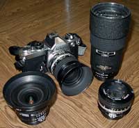 赤滝までで,予定以上に時間(とフィルム)を消費してしまった私は,ややピッチをあげて歩いていた。そのペースで,これらのアップダウンを通過したわけである。その結果,足を軽く痛めてしまったようだ。普段の運動不足が,こういうときにたたるのである。帰り道では,完全に,下り坂が辛い状態になっていた。荷物が軽ければ,さほど負担もかからないようであるが,少ないはずの,カメラと三脚の重さが非常にこたえたのである。この日,持っていったカメラとレンズは,右の画像の通りである。これに,およそ2.7kgの三脚が加わるが,トータルで,5kg程度にすぎないはずなのだが・・・。