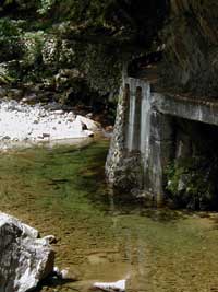 三段滝方面へ進む道は,柴木川に沿う。これを進むと,峡谷最大の見所といわれる「三段滝」に到達する。それをさらに進むと,餅ノ木の集落へ至る。さらに柴木川を奥へ進むと,娘滝,出合滝,繰糸滝,竜門,貴船滝,そして三ツ滝などの見所が連続する。そして,最後に道を登りつめると,樽床ダムに到達し,目の前には聖湖が美しく広がる。 さて,二段滝方面へ進む道は,田代川に沿う(左の画像)。これを進むと,猿飛から二段滝への渡し船の乗り場がある。昭和59年秋に,はじめてここを訪れたとき,猿飛の絶壁の高さと,深さを感じる水の色に感動したものだ。しかし,平成になってすぐのころに,ふたたびその感動を求めて訪れたときには,その数年前にあった水害の影響で,猿飛は浅く埋まっており,二段滝も崩れて美しさを失っており,大いに失望したものだった。それから10年ほどが経つわけだが,現在はどうなっているのだろう?気にはなるが,今日はこの先へ歩くことが主目的だから,寄り道はしない。