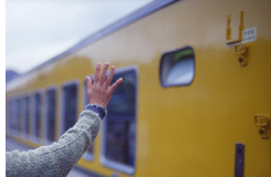 三段峡行きを撮った後,それが折り返してくる列車に上殿駅まで乗車したが,さすがに人が多い(9月に三段峡まで乗車したときのような激しい混み方ではなかったが)。しかも,途中で乗ってくる人,降りていく人も多い。地元の人びとが,惜別乗車のような乗り方をしていたようだ。上殿駅でも私を含めて,何人かが下車した(それでも車内はまだ混んでいる)。私は発車する列車を撮っておこうとカメラを構えた。すると,目の前で列車に手を振る人がある。つい,その人にピントをあわせてシャッターレリーズボタンを押してしまったわけだが,とりあえず手を中心にトリミングをしてみた。
