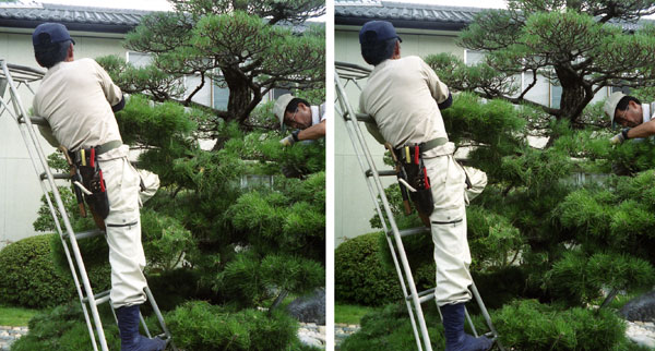 ステレオ写真に適した被写体は,まずなんといっても奥行きのあるものである。たとえば右の例は,左側の人が手前に,右側の人が奥になるようにし,全体が斜めに配置されるように撮ることで,奥行きを得ている。さらに,背後の樹木が近いところにあるので,この枝ぶりにも立体感があらわれていたりする。