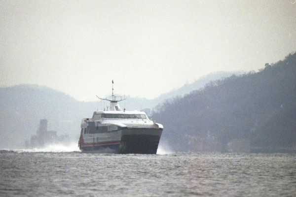 SIGMA MIRROR TELEPHOTO 1000mm F13.5, Venus800海岸から,遠方を航行する船舶を撮ってみた。さすが瀬戸内海は,船舶がひっきりなしに航行する。四国への高速船,近くの島へのフェリー,貨物船,漁船,プレジャーボート,さらには自衛艦すら遠望できた。船舶の数は多いので,シャッターチャンスも多そうなのだが,1000mmという望遠レンズで見るせいか,どれも動きが速い。おいかけていられないのである。鉄道であれば,それは必ず線路上を通るので,「置きピン」という方法が使えるが,相手が船舶では,そうもいかない。また,海上は湿気があるのか,視野がかすんでいて,なかなか絵になりそうにない。