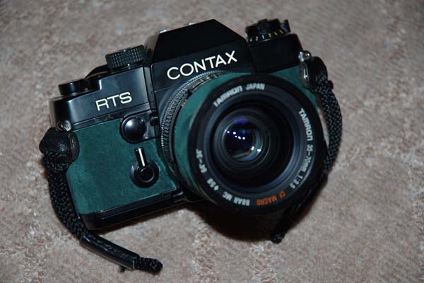 2005年02月08日(火) 天気:曇ときどき晴緑のRTSせっかくいただいた,ヤシカ「CONTAX RTS」であるが,ヤシカMLマウントのレンズが,シグマのミラー1000mm 13.5だけ,というのでは,さすがに使い道がない。そんなとき,とりあえずの強い味方は,タムロン・アダプトールシリーズである。幸い,同時にいただいたタムロンSP500mm F8にはヤシカMLマウントがついていたわけで,すでに所有していたタムロン・アダプトールシリーズのレンズが,すぐに活用できる状態になった。 こういうとき,もとと同じような革を貼ってもおもしろくない。そこで,個人的に好きな,スエードを貼ってみることにした。こういうことに使う革は,すなおに東急ハンズで物色する。以前,「ヤシカフレックスC」(Yashicaflex C)の革を貼りかえたときは,目だつように薄いブルーの革を選んだが,今回はCONTAX RTSに似合いそうに思えた色として,濃い緑色のスエードを選んでみた。