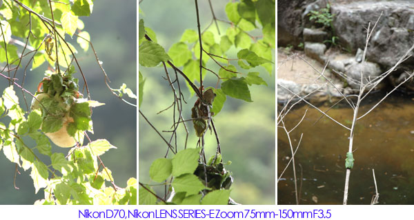 2005年06月12日(日) 天気:曇ときどき晴モリアオガエルと出会う昨日,中国地方も入梅したらしい。昨日の朝はものすごい雨だったし,来週の週間予報でもすっきりしない日が多い。しかし,今日は,雨は降らないという予報だ。そこで,三段峡へ行くことにした。 三脚を「マスター」にして装備の軽量化をはかりながら,レンズは超広角,広角,標準,望遠と欲張ったものである。 期待通り,道中のいつもの場所で,多くのモリアオガエルの卵に出会うことができた。ここで何枚か撮影し,さらにピントグラスを覗くと,なにかもぞもぞしている。あらためて木の枝を見上げると,モリアオガエルが集まりはじめているではないか。これから産卵をはじめそうな気配である。ここで予定変更である。なによりも「マスター」では,木の枝に近づいて撮るには,全高が足りないのだ。さっさと荷物を片付け,駐車場まで戻り,機材を次のように交換した。 少々急ぎ足気味で,1時間ほどで往復し,戻ってみると,やはり産卵であった。卵が少しずつ大きくなっている。数匹のモリアオガエルが1箇所に群がっている(こういう状態の枝が2箇所ほどあった)。これまで,モリアオガエルの卵は何度も見たが,産卵しているときを見るのははじめてであったので,今日はここだけ撮ることにしたのである。