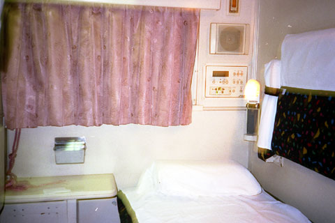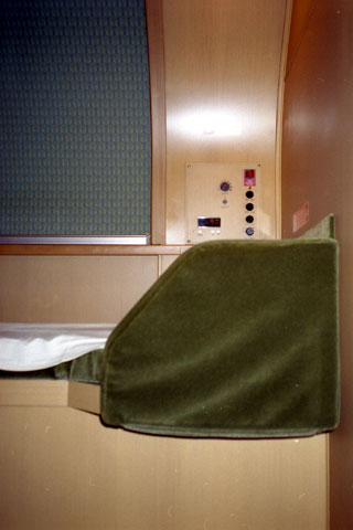 もっとも,寝る空間として考えれば,決して狭いものではない。荷物を置く空間は十分にあるし,ベッドに座っても十分な高さがある。窓は,たいへん大きなものを独占できる。また,枕もとのパネルには,イヤホンジャックがあり,これでNHK−FM放送を聴くことができる。これは,たいへんありがたいサービスだ(中波のNHK第1放送も選ぶことができるともっといいのだが)。