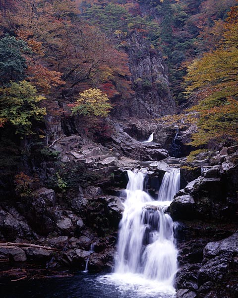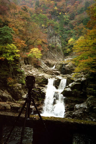 2005年11月03日(木・祝) 天気:曇のちときどき晴しのごの言わずに4×5を持って行く気がつくと,紅葉のシーズンである。例年なら,先々週末くらいから,ぼちぼちと紅葉のようすをうかがいにでかけているのだが,先々週末は生憎の雨模様だし,先週末は東京へ出張だった。まあ,例年,三段峡は11月3日あたりが見ごろになるので,今年も同じような傾向だろうと考え,三段滝へ向かうことにした。 そして,スリック「ザ・プロフェッショナル」を担いで,出発である。もっとも,駐車場に到着してからフィルムをフィルムホルダに装填したので,出発は8時近くになってしまった(笑)。ともあれ,今日は4×5判だけで撮る,という覚悟である。ほんとうは,マミヤプレスを持っていきたい。しかし,重くなってしまう。(ポケットのなかに,オリンパスXAを入れておいたのは,秘密。) 三段滝に到着し,とっとと撮影をすすめる。