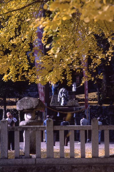 2005年11月20日(日) 天気:晴「銀杏黄葉(いちょうもみじ)」は季語らしい筒賀神社の大イチョウは,先週,ほぼ全体が黄葉していた。その1週間後である今日あたりは,そろそろその葉が落ち,地面を黄色く埋めはじめていることが予想される。また,天気予報では,午後から天気が少し崩れる傾向にあるという。天気が崩れ,風が吹けば,ますます葉が舞い散ることであろう。そこで,お昼前くらいに,筒賀神社を訪れることにした。もっとも,そういう時間帯に訪れると,人が多く来ているだろうことは,覚悟せねばならない。 さすがに,人が多いので,あまり引きをとらずに,木に近づいて,見上げるように撮ることにした。社殿に向かって左側から見上げれば,順光である。また,こちら側は,昨年の台風で枝が折れ,少し見通しがよい。宮司さんのお話によれば,今年は例年よりも来訪者が多いという。平日の早朝などにも,多くの人が写真を撮りに来ているそうだ。今日も,ハッセルブラッドらしいものを手持ちで撮っているひとや,大きな脚立に上って撮っている人などもみかけた。