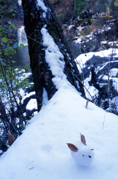 2005年12月05日(月) 天気:雪のち晴ニコノスIV-A様と雪の朝天気予報は,あたった。 仕事にでかける頃には,地面の雪はかなり融けはじめていた。ときどき,白い塊が降ってくる。電線についた雪が落ちてきているのだ。電線から落ちてくる白い塊,固まっていない雪だから,直撃を食らっても,冷たい思いをして,少し濡れるだけだから,まあ,よしとしよう。何年も前の秋のある日,ハトが多くとまっていた電線から降ってきた,白い塊の直撃を受けたことにくらべれば,被害は「ない」に等しいんだから。そういえば,それは教育実習に行く朝だったかな。 「ニコノスIV-A」様は,水深50mの水中でもそのまま撮影が可能な防水カメラである。したがって,雨や雪にちょっとあたった程度では,なんのダメージも受けることはない。キヤノン「EOS−1v」などのいわゆるフラッグシップ機がいかに防滴性能を誇示しようと,そんなものは月とスッポンポン,言語道断横断歩道である。などと言ったところで,写真を撮る道具として,どちらが使える場面が多いのかは,ちょっと考えればわかるだろう。「ニコノスIV-A」様のピント調整は目測式である。ビューファインダーには,パララクス補正などのしくみもない。つまり,精密なピントあわせやフレーミングとは,まったく無縁のカメラである。これを短所ととらえるべきか,あるいは,細かい調整に気を取られることなく,気軽にシャッターをレリーズしていくことができるという長所ととらえるかは,人によって違いがあるだろう。ただ,多くの人はどちらを選ぶだろうか,だいたい予想がつくというものだ(きと,ニコノス様は,選ばれないだろう)。