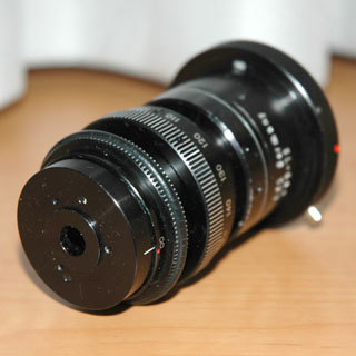 まず,このレンズを眺めてみよう。一般的に,カメラ用交換レンズには,メーカー名,焦点距離,絞りなどの数値などが記載されている。このレンズには,70mmから140mmまで,10mm刻みで目盛がつけられたリングがあるので,70mm〜140mmの望遠ズームレンズのようだ。また,レンズ先端は回転するようになっており,そこには無限遠のマークと赤外フィルム使用時の補正用と思われる赤い小さな指標が記されている。したがって,ベローズ用レンズやマクロ撮影専用レンズではなく,無限遠までピントが合うようになっているものと思われる。