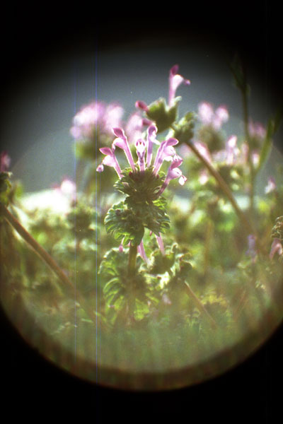 2006年04月01日(土) 天気:曇STORZで撮る「カール・ストルツ」の内視鏡用レンズ「593-T2」だが,ライトボックスの上においた定規だけを撮ったところで,なにもおもしろくはない(2006年3月30日の日記を参照)。さっそく,屋外で実際になにかを撮ってみよう。 このレンズは,最大撮影倍率がおよそ1:1.4の「望遠ズームマイクロレンズ」として使えそうである。となると,小さな花をとりあえず被写体にしてみるのがよい。この季節なら,ホトケノザが最適だろう。ホトケノザは,ちょっとした公園の隅や道ばたなどで,簡単に見つかる。やや逆光気味の花を見つけて,さっそくファインダーを覗いてみた。「593-T2」は,たいへん暗いレンズである。したがって,ファインダーの視野も,たいへん暗い。大口径レンズではないために,ファインダー上では,被写界深度はかなり深く見える。しかし,撮影倍率が高い状態であることもあり,屋外の明るい場所での被写体ならば,ピントあわせは十分に可能である。