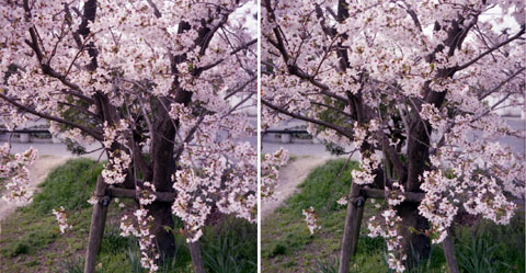 Kodak Stereo Camera, 35mm F3.5, GOLD100・・・・などとつぶやいてみたが,きれいな青空を背景に,順光状態で雄大にサクラを撮ってみたいと思っていないわけではない。しかし,余裕のある日に天気がよいとはかぎらない。この要因は,無視できない大きなものである。 ところで,これらのステレオ写真は,このままPCのディスプレイで立体視できる大きさになっているはずだ。しかし,ディスプレイ上では,いまひとつ細部がよく見えず,立体感も少ないかもしれない。十分な大きさと解像度で出力して立体視すれば,花びらの1つ1つも見えてくるような気がするわけだが,上にある画像をこのままプリンタ出力しても,十分な大きさと解像度の画像は得られないことはご了承賜りたい。 |