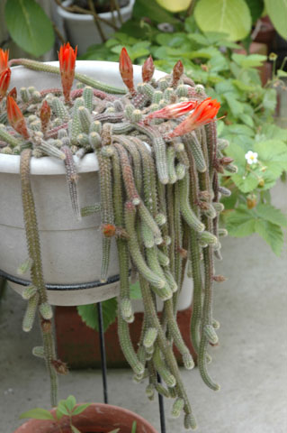 Nikon D70, AF DX Zoom-NIKKOR ED18-70mm F3.5-4.5G実に平凡な,どこにでもありそうなサボテンである。茎は細く,ひょろひょろと伸びている。冬に,うかつにも雪にあててしまったりすると,真っ赤になって縮みあがり,枯らしてしまったか?と気になったりもする。それでも春になると,ときどき子株が出ては,土の上に落ちて,適当に増殖していったりする。 そんなサボテンだが,毎年,この時期になると,きれいな花を咲かせてくれる。