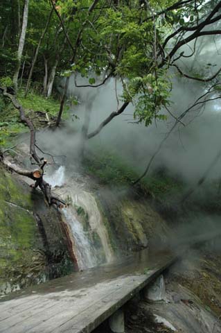 Nikon D70, AF-S DX Zoom-NIKKOR ED18-70mm F3.5-4.5G「かんけつ泉」の近くには,「吹上温泉」への道標があった。それにしたがって進んでみると,道はまもなく終点になり,駐車場になっている。そこから,木道(遊歩道)が伸びており,それを降りて行ってみた。そこは,足元のいたるところに小さな間歇泉がある,いわゆる地獄沢であった。大小さまざまな間歇泉が吹き出すそれは,たいへんおもしろい。沢の途中の,少し開けた場所では,間歇泉でたまごや山菜を煮ているグループも見られる。
