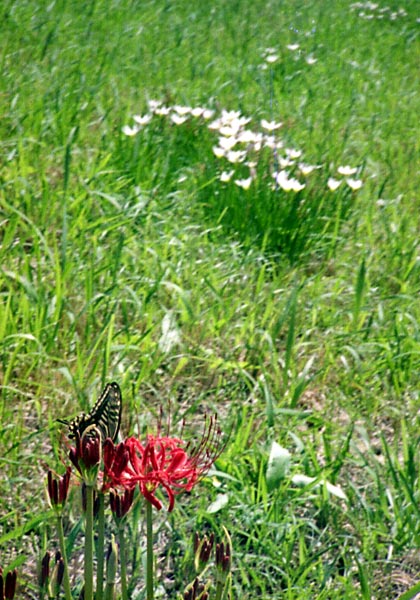 2006年09月20日(水) 天気:晴auto110でヒガンバナを撮る先週は台風の接近もあったりして,天気のすっきりしない日も多かった。今週は一転して,好天が続きそうである。例年より1週間ほど遅いようだが,今年も土手に,ヒガンバナが多く見られるようになってきた。 花の撮り方にもいろいろあるが,もっともポピュラーな方法の1つとして,「マクロ撮影」があげられるだろう。ここでいう「マクロ撮影」とは,花や小物などに接近して,1/2倍程度の倍率(フィルム上に写った像の大きさが,実際の大きさの1/2倍程度であるという意味)で撮影することを指している。ところで,本来「マクロ撮影」とは,「原寸大以上の倍率での撮影」(フィルム上に写った像の大きさが,実際の大きさよりも大きい)という意味であるらしい。したがって,一般的な「マクロレンズ」による撮影は,厳密には「マクロ撮影」ではないことになる。ましてや,廉価版ズームレンズ等でよく見られる「1/4倍までのマクロ機能つき」などという表現は,大ウソつきの拡大解釈誇大表現以外のなにものでもないわけだ。しかし,一般的にはそれを「マクロ」と呼んで支障がないのが現状のようである。 もし,中判カメラや大判カメラを使う場合はどうだろうか。 ということで,PENTAX auto110に「マクロレンズ」が用意されていなかったことが,たいへん惜しまれるのであった。
