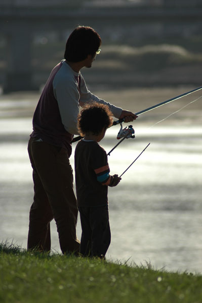川面に反射する光のなかに,釣りを楽しむ人たちのシルエットが浮かび上がってくる。やはり,「逆光は勝利」である。ネオパン100を装填してシャッターをレリーズした。