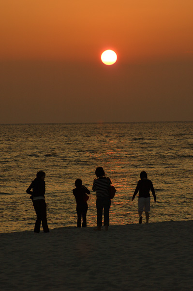 ここには「写真を撮ること」を目的に訪れたわけではない。そのため,ディジタルカメラだけで,カメラはもってきていない。また,三脚をもってきているはずがなく,無謀にも手持ち撮影である。APS-Cサイズの撮像素子をもつディジタルカメラの場合,写しこまれる範囲は,ライカ判にくらべると,レンズの焦点距離で1.6倍相当になる。長焦点側が300mmのズームレンズの場合,最大で480mmレンズを手持ち撮影するようなものになる。幸い,被写体が夕陽であり,手前の人物などはシルエットにしてしまいたいので,露光時間はごく短くて済む。だから,手ブレはあまり目立たないであろう。また,もっと露光時間を短くしたければ,「感度」をあげるという手もある。1コマごとに「感度」を変えられることは,ディジタルカメラの大きなメリットの1つである。