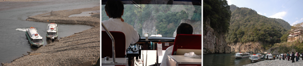 この付近は,かつて道路事情が悪く,川を通る船が主要な交通手段であったという。しかし,川は決して深くないのでスクリューが使えず,大正時代になって「プロペラ船」(水中ではなく,船の上部に設けられたプロペラによって推進力を得て航行する)が発明されるまでは,両岸から人が綱で船を引き,川をさかのぼっていたという。その後,道路が整備され,現在,船は観光用としての役割を担っている。