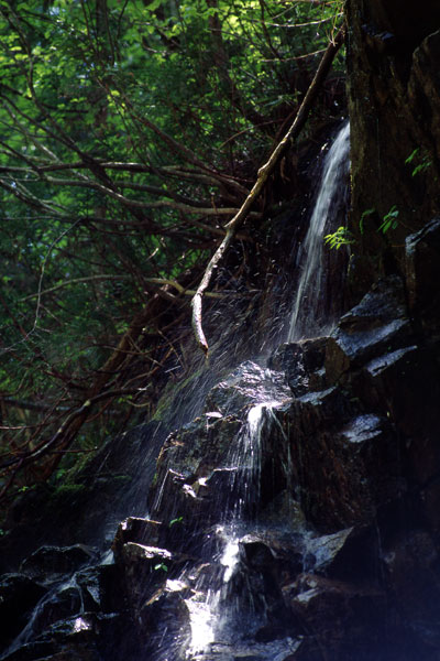お昼ころにここを訪れると,ちょうど水の落ちてくるあたりから,日光が差しこんできて,細く流れ落ちる水や,それが岩にあたってはねかえるところがきらきらと輝いて見える。この写真は,そんなときを狙ったものだ。