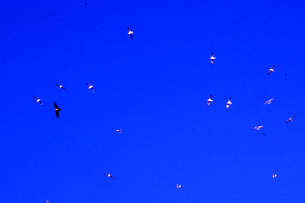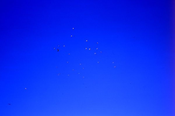 雁木タクシーの船上では,距離計連動ファインダーを利用して,手持ちで撮影をおこなった。ちょうど見上げれば,鳥が群れをなしている。それを手持ちでパチっと撮る。アオリ撮影もできれば,こういうスナップ撮影もできる,「マミヤプレススーパー23」は,ほんとうにグレートなカメラだよ。