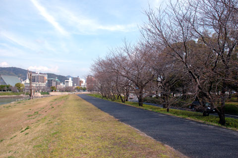 2007年03月25日(日) 天気:曇のち晴サクラはまだかいなこの冬は,記録的な暖冬であった。そのため,「今年のサクラは,例年になく早く開花する」と囁かれていた。しかし,その一方で,「十分な寒さを経ていないので,むしろ開花は遅くなる」と見る人もあった。気象庁による3月7日の発表では広島の開花予想日は3月25日,同じく3月14日の発表では3月26日であった。しかし結局,3月22日に広島での「開花宣言」が出たわけである。なお,ここでいう「開花」とは,花が5〜6輪咲いた状態を指し,開花から満開までは約1週間とのことである。 横川から本川沿いの右岸を歩き,空鞘橋を渡って左岸に移る。ちょうど,先々週に歩いたのと同じようなルートである。このあたりには,「基町POP'La通り」という名前が与えられているが,まだあまり知れ渡ってはいないようだ。このあたりのサクラは,花芽がかなりふくらんできているものの,開花にはいたっていないように見える。そのときちょうど,リバークルーズの「すいすい」が通りすぎていった。