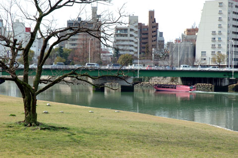 Nikon D70, AF-S DX Zoom-NIKKOR ED18mm-70mm F3.5-4.5G結局,平和公園まで歩いても,開花しているサクラに出会うことはなかった。サクラがいないのではしかたがない。ついつい,川を行く船にカメラを向けてしまうのである。今日も,「すいすい」のほか「るんるん2」「きらら」や,雁木タクシー,さらには「花見船」までさまざまな船が,多くの人を乗せて行き交っている。これはまさに,広島の特徴的な光景と言っていいであろう。