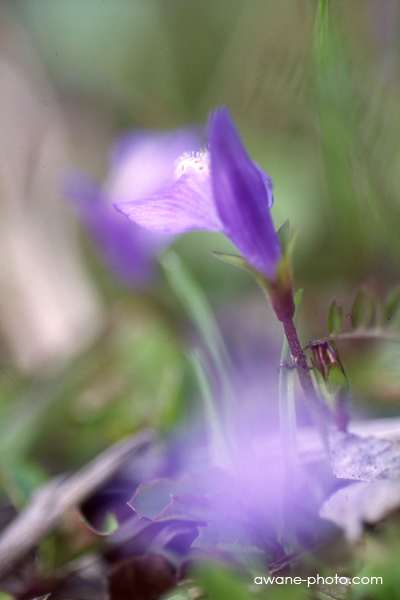 Nikon F3, AF Micro-NIKKOR 105mm F2.8S, EBこれは,「サギゴケ」と呼ばれる花のようだ。コケのように地面をびっしりと覆い,「ゴケ」という名前がついているのであるが,コケの仲間ではない。このように紫色の花のものは「ムラサキサギゴケ」と呼んで,白色の花のものと区別することもあるとのことである。おもしろいことにこのあたりでは,白い「サギゴケ」と「ムラサキサギゴケ」が混在していない。きれいに群落が分かれている。上の写真のように,白と紫が隣接しているところは,あまり多くないのである。地面をびっしりと覆ってしまうことから,自分の群落以外の植物をその場所から締め出してしまうのだろうか。