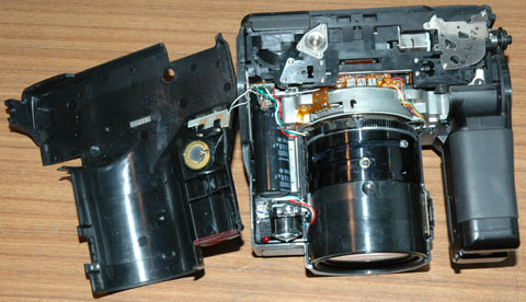 1〜3の状況から見ると,電子回路はまだ生きていると思われる。4の状況であるが,通常,この種のカメラは電源をOFFにしたときに,レンズがもっともひっこむはずである。そのとき,焦点距離はもっとも広角側に,ピントは無限遠になっていることが多いのではないだろうか。ところが,LCDの表示を信用するなら,焦点距離は60mm付近(このカメラのレンズは,35mm-135mm F4.2-5.6である),ピントは最短撮影距離付近を示している。このことから,内部で機械的になにかひっかかるものがあり,動作しなくなっているものと予想した。