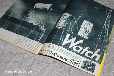 「POPEYE」1979年7月25日号さて,肝心の記事の内容であるが,予想していたよりも充実していたし,内容もしっかりしていたように思う。ただし,独特の軽さを感じる話しことばでの記事は,慣れないと少し読みにくさを感じてしまうかもしれない。特集のなかでは,ミニFM放送としての遊び方の提案,こんなものがあればいいというような機材の紹介などのほかに,いわゆる「海賊放送」のことや,アメリカなど海外のFM放送局の事情もあわせて紹介されていた。のちにマスコミが,「アメリカンDJ風」と呼ばれたスタイルのミニFM放送局を「かっこいいもの」や「主流」として扱っていったことへの影響を,まちがいなくおよぼしていたのではないかと思ったりする。そう,「POPEYE」のこの特集こそが,のちの「ミニFM放送局」ブームの原点になっているのだろう。ところで,実際のミニFM放送局には「アメリカンDJ風」のものだけでなく,微弱電波の規定を大幅にこえる強力な電波を使った「海賊放送」とよべるようなものも登場しているが,それについてもこの「POPEYE」は取り上げている。全体に,1つの遊びを紹介するという軽い記事であるのだが,取材はかなりしっかりとされているようだ。 さて。一般的に見て,「POPEYE」はファッションを中心とした雑誌としてカテゴライズされるだろう。そして,ファッションアイテムだけでなく,さまざまなアイテムの広告もいろいろと見ることができる。そんななかに,カメラの広告もいくつか見ることができた。ここでは,それについて紹介しておきたい。 まず表紙を開き,目次をめくると,モノクロ紙面だがいきなり2ページ見開きで「キヤノンA-1」の広告があらわれたのである。3つ並べた缶の1つを撃った瞬間をとらえた写真のようで,超望遠レンズの使用と「キヤノンA-1」のシャッター速度優先AE機能がアピールされているようだ。ただし,設定したシャッター速度は1/1000秒らしく,まだまだのんびりした時代である。なお,ニコンF-801が1/8000秒を宣伝したのは,このおよそ10年後になるわけだ。