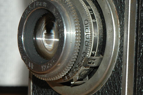 もう1つのリコーフレックスは,ネームプレートが失われているのだが,セルフタイマー付きで1/10秒〜1/200秒のリケン・シャッターが使われていることから,1955年に発売された「リコーフレックスVIIs型」(ケース付き8300円)と思われる。ところで,このカメラの巻き上げノブには,0から35までの数字が刻まれている。おそらくは,35mm判フィルムでの撮影ができる「リコー・キン」というオプション装置に対応しているのであろう。そうなると,「リコー・キン」も入手して,使ってみたくなるというものだ。