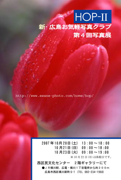 2007年10月01日(月) 天気:晴今年も写真展をやろう2004年5月,2005年7月,2006年10月についで,「新・広島お気軽写真クラブ」の4回目の写真展を,2007年10月20日(土),21日(日),23日(火)の3日間でおこなうことにした。会場は,これまでと同様に,西区民文化センターのギャラリーである。当日,近くへお越しの用などあれば,ぜひお立ち寄りいただきたく思う。 これまでは土曜日,日曜日の2日間の開催であったが,今年はさらにもう1日加えて3日間の開催とする。なお,土・日・月の3日間連続ではないのは,月曜日が「休館日」だからである。また,金・土・日の3日間連続にしなかったのは,平日の午前中は十分な人数が集まらず,準備が難しくなる可能性が高いからである。 さて,今回の展示作品であるが,かなり迷っている。過去3回で「三段峡」「常清滝」「筒賀の大イチョウ」などの「大ネタ」を使ってしまっている。その後に撮った写真を加えて再構成する方法もあるが,それはまた次回以降にするとして,今回は別のネタを使おうと考えている。その結果,今日現在,まだ展示する写真が完全には決まっていない。そろそろ発注しなければ時間切れになってしまうのだが・・・・。ちょっとお困りモードなんだニャー!(笑) なお,開場時間については,以下の通りである。