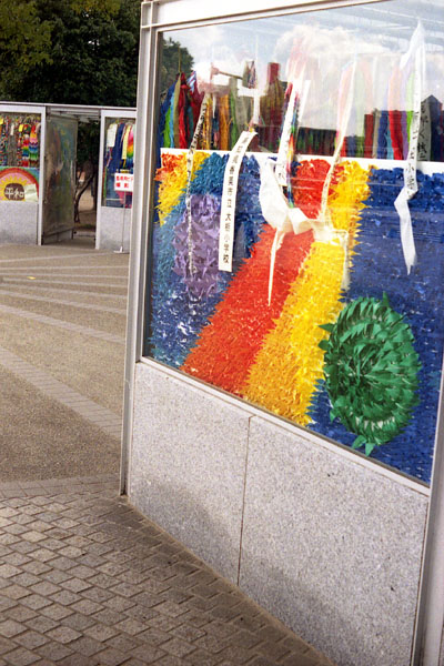 「原爆の子の像」付近では,カラーネガフィルムを装填しているZORKYの方をおもに使う。捧げられている折り鶴の色を楽しみたいからである。2003年8月1日に起きたいわゆる「折り鶴放火事件」以降,ケースに収めるようにして捧げられている折り鶴であるが,それ以前は野積み状態であった。青空の下,折り鶴との色の対比がおもしろかったのだが,そういう写真を撮ることはもうできない。ちゃんと撮っておけばよかった,と悔やまれる。