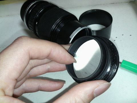 1枚(あるいはそれ以上)のレンズが組みこまれていたと思われる空間が,そこにあった。「いちまぁい,足りなぁ〜い」などと,いまさら恨めしそうに言ってもしかたないのだが,もうどうすることもできない。