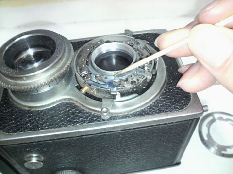 ところが,このカメラの最大の特徴である,そのシャッターの動きがよくない。具体的には,露光時間を1秒に設定したとき,シャッターの動作が途中で止まることがある。こういうときには,動作部に軽く注油すれば,動くようになるはずだ。ただし,過度の注油は,後々に余分な油が望ましくないところに流れ出てくるトラブルにつながる懸念を生じる。注油よりもよい方法があるのかもしれないが,私自身の限定された経験の中では,重大なトラブルにつながっていない(少なくともそれに気がついていない)ので,今回も注油をおこなってみることにする。