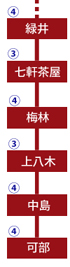 JR可部線の電車は,朝夕のいわゆる通勤通学時間帯には,4両編成の電車が運転されることがある。そのため,大半の駅は,4両編成の電車に対応できる長さのホームをもっているが,七軒茶屋駅と上八木駅については,ホームの長さが3両分しかない。そのため現在,4両編成の電車は,これら2つの駅が含まれる,緑井駅と可部駅との間では,もっとも横川側の1両のドアを閉め切った状態で運転している。利用者にとっては不便であるが右の図のように,緑井,七軒茶屋,梅林,上八木,中島,・・・・と,4両編成に対応する駅と3両編成しか入れない駅が交互にある。これは十分に,ヒューマンエラー発生の要因となりえる。ドアの開閉にともなう事故を未然に防ぐには,ドアの開閉をしないこと,すなわちヒューマンエラーの発生要因を除去すればいいのだから,ヒューマンエラー対策としては妥当なものだろう。もっともそのままでは利用者に不便を強いることが続いてしまう。ホームを延長することで,ヒューマンエラー発生要因を根本から除去しようとしているわけだ。
