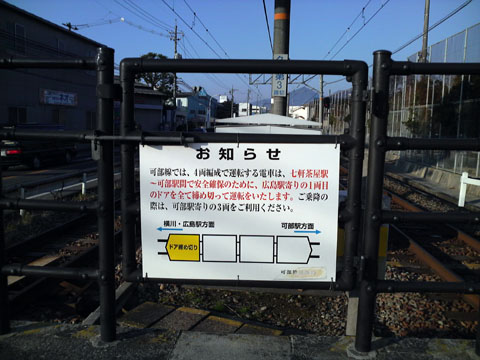 今朝も,可部行き電車は空いていた。先週に引き続き,七軒茶屋駅と上八木駅で朝の,通勤通学時間帯の4両編成の電車がはみ出すようすを見るのが目的である。先に,2008年3月1日の日記を読んでおいていただけると,このあとの説明がくどくならずに済むのでありがたいのだが,あまりそのあたりの説明を端折りすぎると,私が「鉄」のように誤解を受けるので,最低限の説明はしておこうと思う。