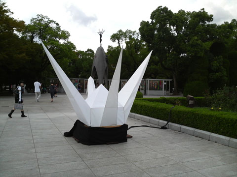 被爆して白血病を患った佐々木禎子が,回復を祈って千羽鶴を折ったという話と,彼女の死をきっかけにつくられた「原爆の子の像」のことは,よく知られているだろう(*1)。だから,その前に巨大な折り鶴があっても,なにも問題ではない。ただ,いままでそこにそんなものはなかったから,驚いたのである。