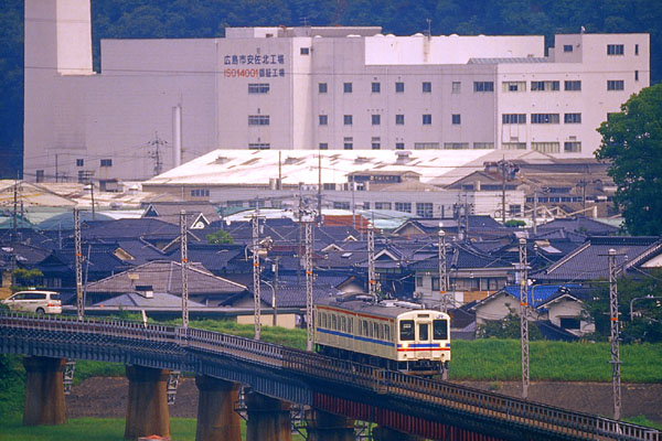 このあと,太田川を渡る鉄橋を正面に近い位置から見える場所に移動。ふたたびNikon F-801にReflex-NIKKOR 500mm F8 (new)をとりつけ,可部駅からの電車を撮った。