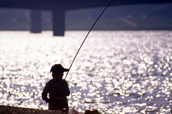 日に日に,日没が早くなってくるこの時期。15時くらいには,太陽の位置はかなり低い。満潮に近く,太田川放水路の水位も高い。川面がまぶしく輝きだすころ,その煌きのなかで,川岸の釣り人たちが美しくシルエットを描きはじめる。背景になる川面の反射を存分に引きつけられる,超望遠レンズの出番だ。