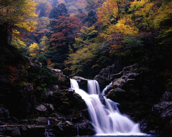 三段滝の方へのぼり,遊歩道から少しおりると,三段滝の下段の上に出ることができる。ここから展望台の方を見ると,深い峡谷に紅葉が覆いかぶさるようで,ひときわ美しく感じられる。しかし,ここまでにかなりの時間を使ったせいか,すでに展望台には,三脚を立てた人たちの姿がちらほら見える。