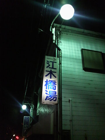 このあたりかな?と思うところで,大きな通りをそれて右に曲がる。道の両側には,すでに営業時間を過ぎてしまったようで,暗く静まり返るお店がぽつりぽつり。そんな道の先に小さく光る看板を見つけ,近づいてみると,そこが目的地「江木橋湯」であった。