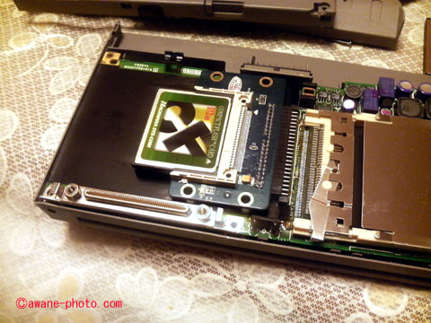 この製品には,CFカードを2枚セットして使うことができるが,今回は512MBのものを1枚だけ使うことにする。HDDを抜いたら裏蓋をはずし,CFカードをセットしたアダプタをHDDのかわりに装着する。