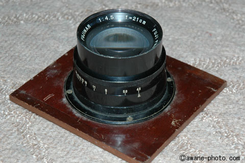 このレンズは,FUJINAR 21cm F4.5というものだ。見ての通り,このレンズにはシャッターもなければピントリングもない。ただ,絞りだけはある。このようなバレルレンズは,フォーカルプレンシャッターを内蔵した大判カメラで使うことができる。そして,フォーカルプレンシャッターを内蔵していない大判カメラで使うときには,このようなシャッターユニットを併用する。