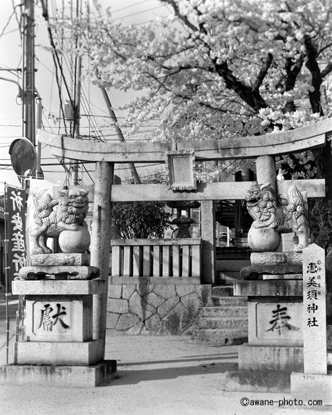 この神社のサクラにカメラを向けている人を見かけることは,あまりない。それはそうだろう,背後に電線が密集しており,きわめて目ざわりである。また,道路も狭く歩道もなく,三脚を立てるポジションがほとんど選べない。ふつうに考えて,「絵になる」ようなサクラではない。枝ぶりがよく,背景がすっきりしていて,三脚を立てやすい,そんなサクラなど,ほかに行けばいくらでも見つけられるというものだ。このサクラを撮る人があるとしても,ご近所の人がお散歩がてら,携帯電話機のディジタルカメラ機能を使って記録するくらいのものである。